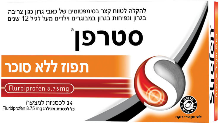 סטרפן לכסניות למציצה בטעם תפוז ללא סוכר.להקלה לטווח קצר בסימפטומים של כאבי גרון, כגון צריבה בגרון ונפיחות בגרון במבוגרים וילדים מעל לגיל 12 שנים.יש לעיין בעלון לצרכן לפני השימוש.