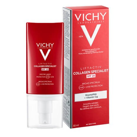 וישי קולגן ספשליסט קרם יום אנטי אייג'ינג מתקדם הכולל הגנה מהשמש SPF25 קרם יום לעור פנים המכיל הפפטידים הבונים קולגן יחד עם ויטמין סי להחלקת מראה הקמטים וטיפול ממוקד בכתמי עור. נותן הגדרה נהדרתמ לקווי המתאר של הפנים ומגן מהשמש אשר מזיקה ומזקינה את עור הפנים שלנו הקרם מיועד לכל סוגי העור ומותאם לעור רגיש - ללא פראבנים מפחית את מראה הקמטים נותן הגנה מהשמש וע"י כך מגן גם מפני כתמי עור (פיגמנטציה) העור נראה צעיר יותר, מוצק יותר וקורן יותר גוון העור נראה אחיד יותר וסימני פיגמנטציה קלים פחות נראים לעין כמובן שהמוצר מכיל גם מים טרמליים ממעיינות וישי המכילים מינרלים עוצמתיים לעור הפנים. לא.נשים המחשים ומחפשות אנטי אייג'ינג ועור פנים זוהר במיוחד מכיל 50 מ"ל. שגרת הטיפול: מריחה על עור פנים וצוואר נקי מדי יום בבוקר.