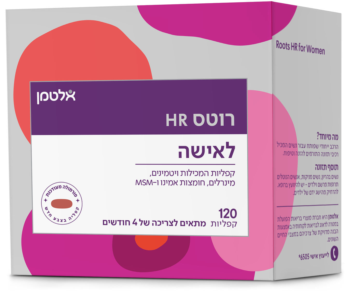 רוטס HR של אלטמן מארז זוגי (60*2 קפליות) • פורמולה שפותחה במיוחד עבור נשים • ויטמינים ומינרלים, חומצות אמינו ו-MSM תכולה: ויטמין B1 (Thiamine mononitrate) 2.5 מ"ג ויטמין B2 (Riboflavin) 3 מ"ג ויטמין B3 (Niacin & Inositol hexa nicotinate) 15 מ"ג ויטמין B5 (d-calcium pantothenate) 75 מ"ג ויטמין B6 (pyridoxine) 10 מ"ג ויטמין B12 (CyanoCobalamin) 6 מק"ג חומצה פולית (Folic Acid) 200 מק"ג ביוטין (Biotin) 300 מק"ג נחושת (Copper sulfate) 1 מ"ג אבץ (Zinc oxide) 30 מ"ג ברזל (Iron bisglycinate) 18 מ"ג ויטמין c (Calcium ascorbate & Ascorbiv acid) 120 מ"ג מנגן (Manganese sulfate) 0.5 מ"ג MSM (Lignisul®) 250 מ"ג ל-ציסטאין (L-Cysteine) 140 מ"ג כולין (Bitartate Choline) 25 מ"ג אינוזיטול (Inositol) 25 מ"ג ל-גלוטטיון (L-Gluthatione) 1 מ"ג רכיבים: ויטמינים ומינרלים כמפורט בטבלה, MSM, מגביר חוזק: סידן קרבונט; מתחלב: צלולוז (MCC); ל-ציסטאין, כולין, אינוזיטול, מונע התגיישות: סיליקון דיאוקסיד; מייצבים: חומצה סטארית, נתרן קרוסקרמלוז; מונע התגיישות: מגנזיום סטארט; חומרי הזגה: פוליויניל אלכוהול, פוליאתילן גליקול, מגנזיום סיליקט הידרוקסיד; צבע מאכל: טיטניום דיאוקסיד; ל-גלוטטוין. סימון תזונתי ליחידה/מנה: אנרגיה פחות - 10 קק"ל הוראות שימוש ואחסון: קפליה אחת ביום עם שתייה לפני השינה. לאחסן במקום קריר ויבש, לאחר הפתיחה יש לאחסן בקירור מכיל סופח לחות נשים בהריון, נשים מניקות, ילדים ואנשים הנוטלים תרופות מרשם - יש להיוועץ ברופא טרם השימוש. כשרות: כשר פרווה בהשגחת חוג חת"ס פ"ת ובאישור הרבנות הראשית לישראל. נארז בפיקוח הרבנות אור יהודה.